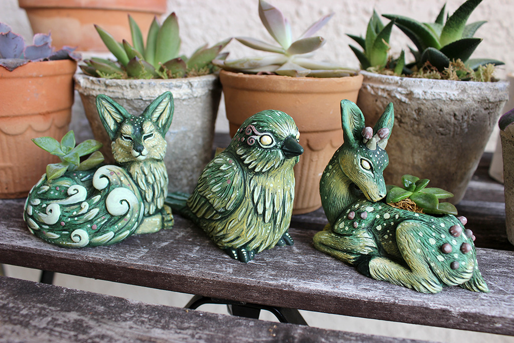 New Mini Planters will be in the shop this afternoon at 2PM EST. Here’s a look at the classic Forest coloration for all three planters. Here we have the Fern Fox, Grasswing, and Thistlehorn, three of the woodland Arbori. Perfect for protecting small air plants and succulents as well as desktop trinkets (I plan on using one as a ring holder!)