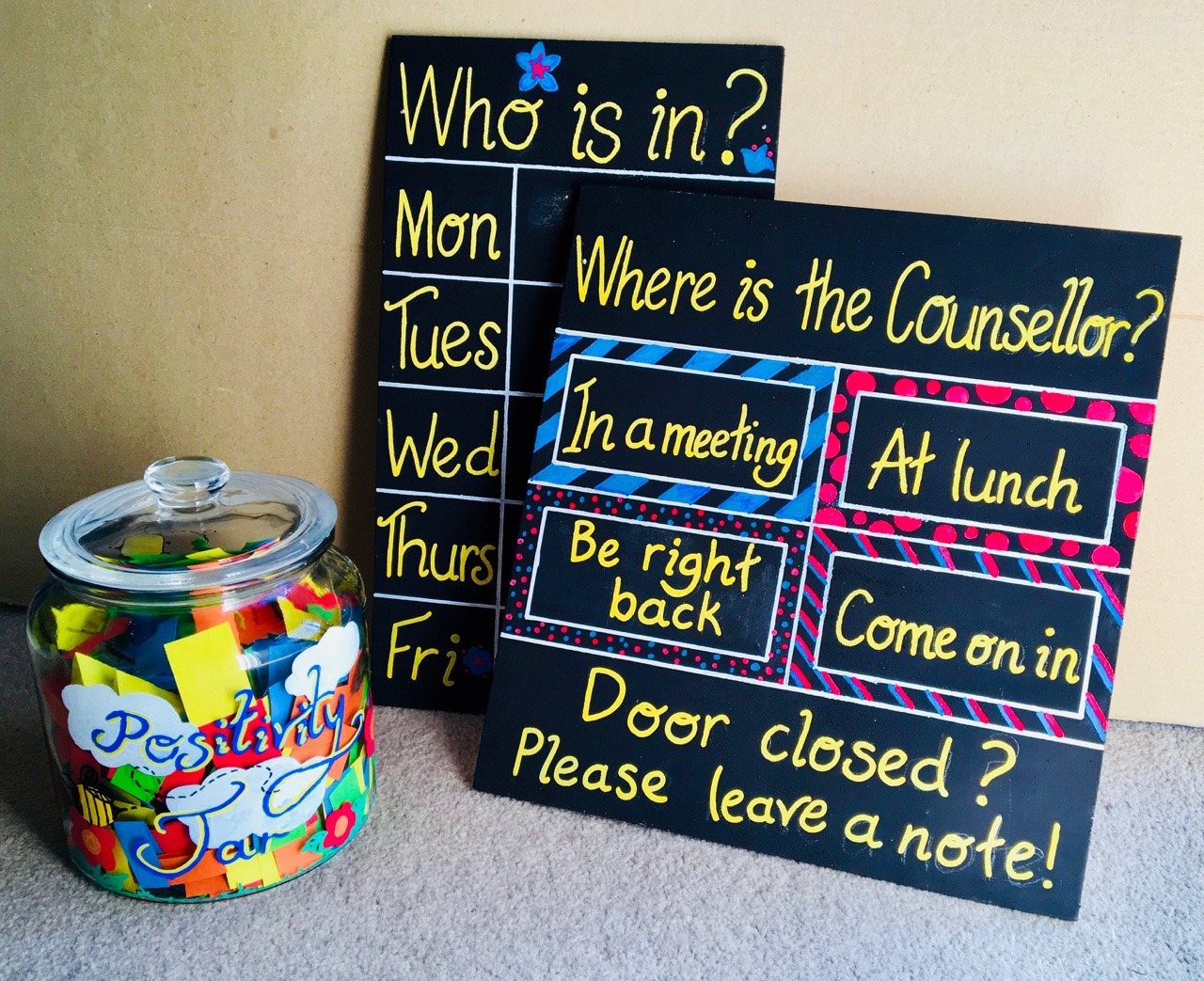 To get the kids in my high school engaged with the counsellor and to help build resilience I made these funky blackboard door signs and a positivity jar!